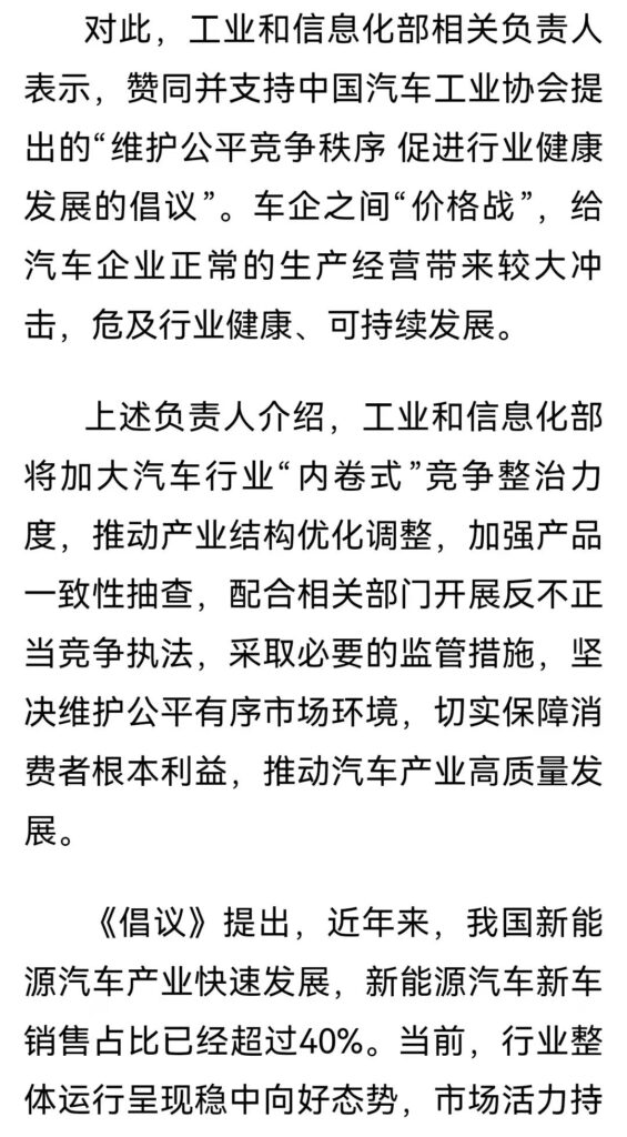 对此,工业和信息化部相关负责人表示赞同倡议。车企之间“价格战”,给汽车企业正常的生产经营带来较大冲击,危及行业健康、可持续发展。