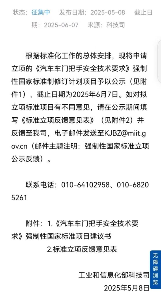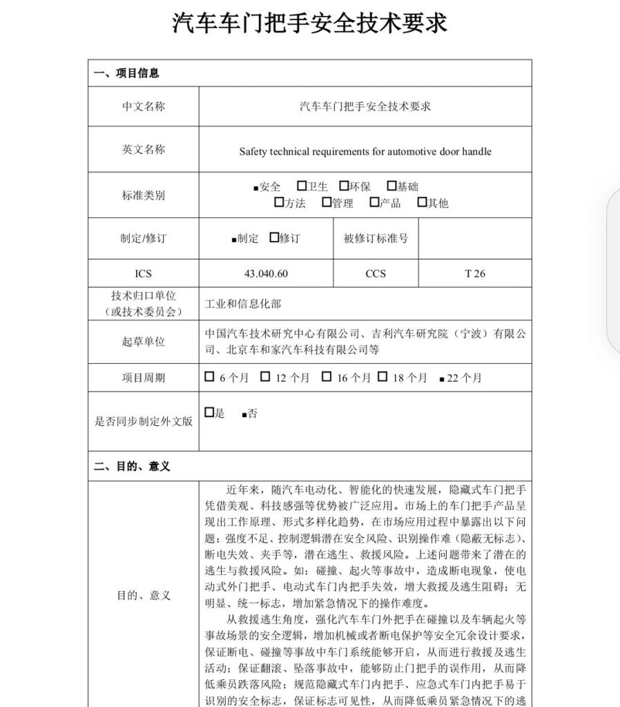 5月8日,工信部官网公开征集意见,拟对《汽车车门把手安全技术要求》强制性国家标准制修订计划项目立项。