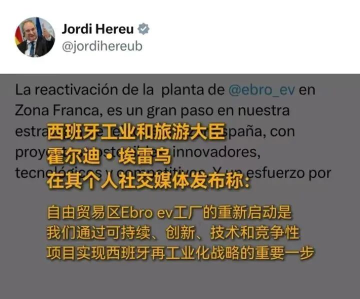 这次,西班牙工业和旅游大臣霍尔迪•埃雷乌在其个人社交媒体发布称,“自由贸易区Ebro ev工厂的重新启动,是我们通过可持续、创新、技术和竞争性项目实现西班牙再工业化战略的重要一步。”而西班牙当地,则竖立巨幅户外广告庆祝合资工厂首台车下线。