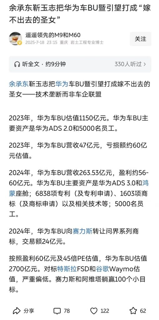 新近又有自媒体撰文称“余承东靳玉志把华为车BU暨引望打成嫁不出去的圣女”。第一眼以为是“黑”;结果全文充斥着“主机厂被打服了”、“技术霸权让资本望而兴叹”等言辞,因而第二眼看起来是极端“吹”;但仔细揣摩,扭曲而极端的“吹”,依然是“黑”。