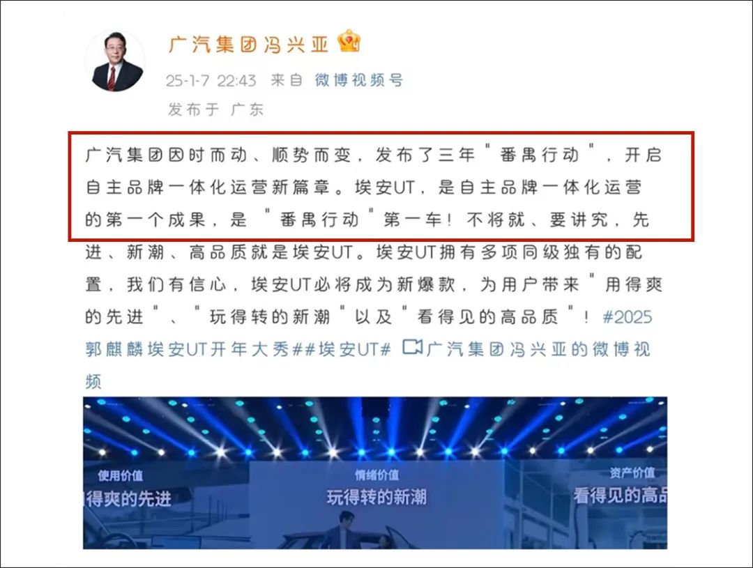 1月7日,总经理冯兴亚在社交平台说到,“广汽集团因时而动、顺势而变,发布了三年‘番禺行动’,开启自主品牌一体化运营新篇章。”并将刚刚开启预售的埃安UT视为“番禺行动”第一车。