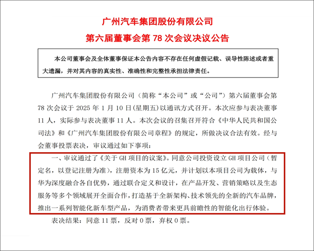 那如今,经由集团的正式公告表露,同意公司投资设立 GH 项目公司,并计划以本项目公司为载体,与华为深度融合各自优势。通过联合定义和设计,在产品开发、营销策略以及生态服务等多个领域展开全面合作,打造基于全新架构、技术领先的汽车品牌。