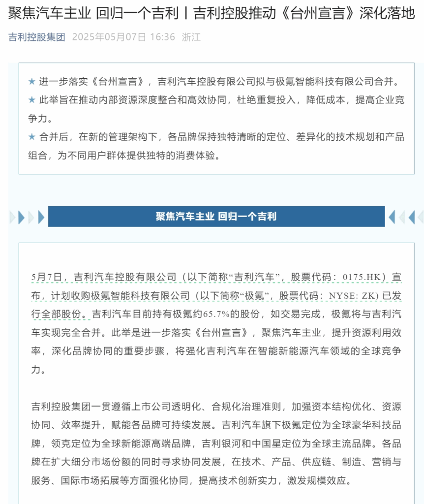 此举是落实《台州宣言》战略框架的持续性动作,旨在理顺股权关系,减少关联交易,消除同业竞争,继续推动内部资源深度整合和高效融合,助力吉利、极氪两家汽车集团在销量、收入及利润方面实现显著提升。