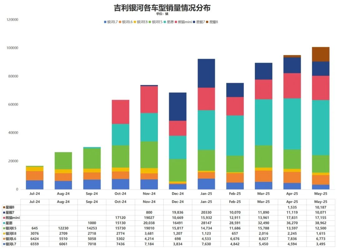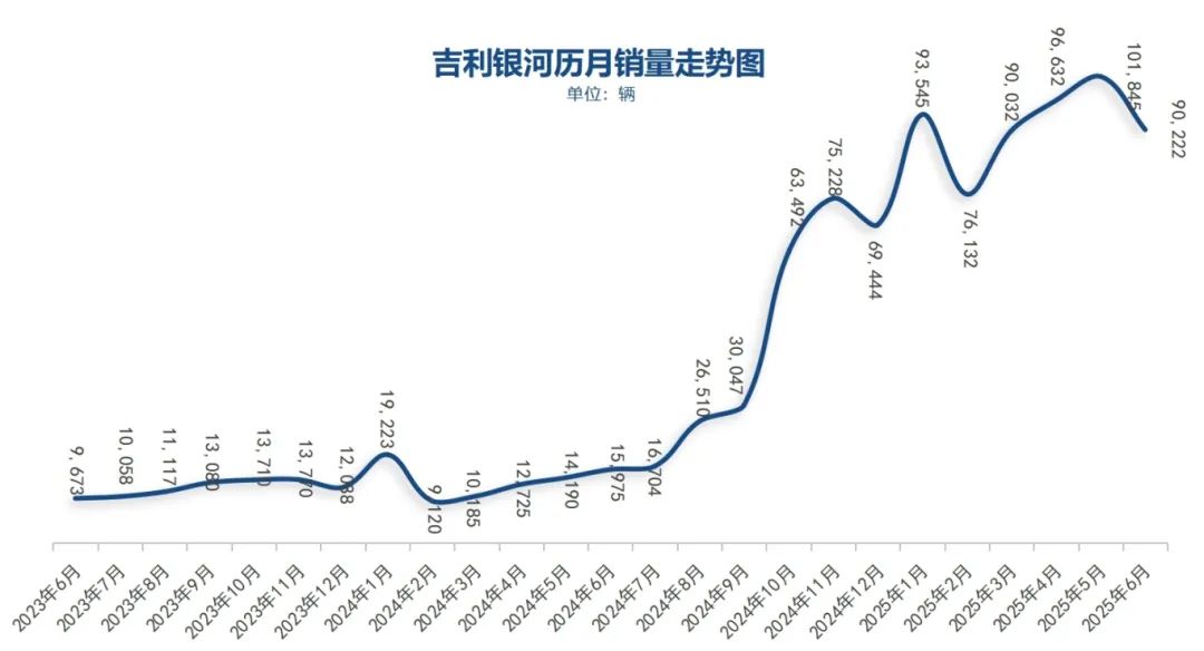 星愿(月均3万+)、熊猫mini(月均1.5万+)、银河E5(月均1.5万)、星舰7(月均1万+)、星耀8(月均1万+)等车型都成为银河旗下的爆款车型。今年下半年,银河还有一款B级家轿银河A7,以及一款旗舰大六座SUV银河M9,从目前上半年月均9万辆的成绩来看,下半年吉利银河保持在月均10万辆的成绩应该不在话下。