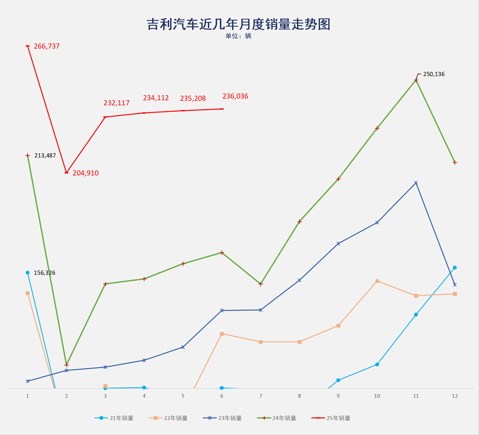如果再摆上一张吉利近几年月度销量走势图,可以明显看到整个2025年上半年,吉利全部保持在20万辆+的月度销量走势,且与2024年和过去几年相比,同比增幅非常可观。