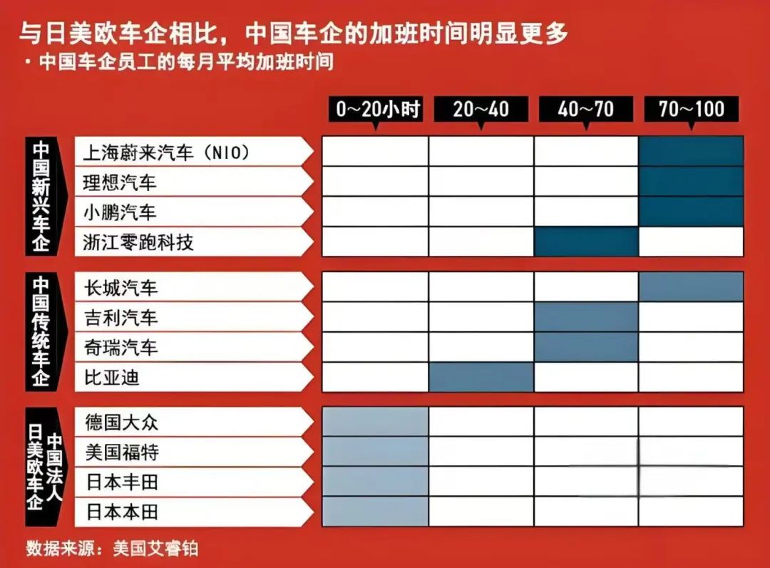 不久前,美国咨询公司艾睿铂就发布了一个关于加班时间的报告,对汽车行业员工每月的平均加班时间进行了比较。结果显示,比亚迪月均加班时间为20~40小时,吉利汽车为40~70小时。蔚来汽车等新兴纯电动汽车企业则达到70~100小时,“卷王式”的工作文化正在渗透。与此相反,德国大众和丰田的中国法人则仅为0~20小时。