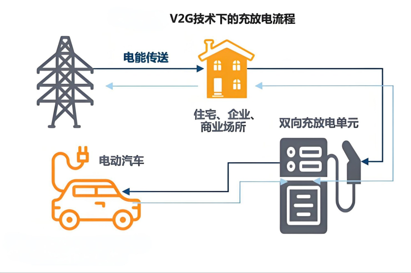 更通俗一点就是,让新能源汽车变身“移动充电宝”, 车辆既能从电网充电,也能在电网负荷高峰时放电,通过 “低谷充电、高峰放电” 实现能源双向流动。