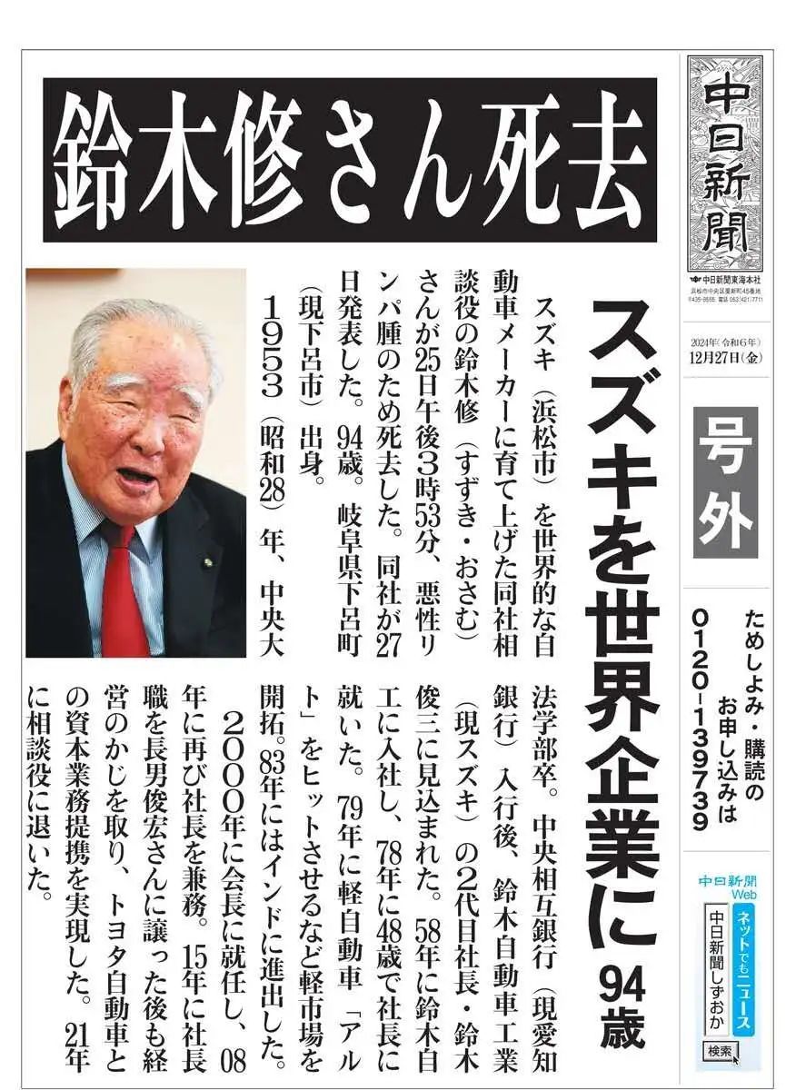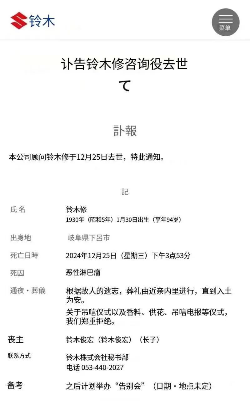 12月27日,日本铃木汽车发布讣告,前社长铃木修因恶性淋巴瘤于25日下午去世,享年94岁。