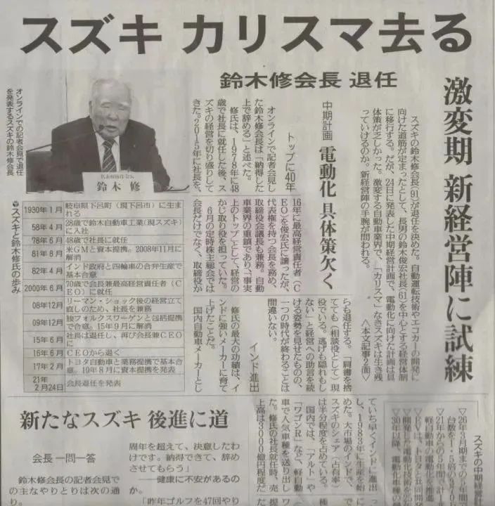 有意思的是,铃木修的后时代来了,但铃木汽车的新时代却没有到来。关于铃木修长期位居高位不放权的问题,业界已有很多分析,其中复杂的历史原因,包括此前第一继承人、其女婿裕隆小野猝然离世等细节,在此囿于篇幅,我们不再赘述。
