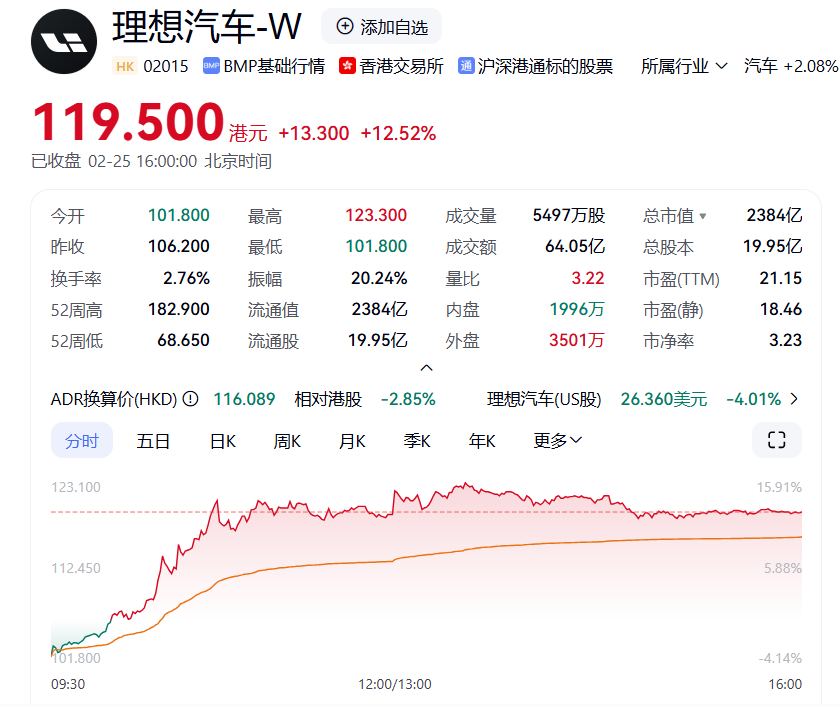 尽管车型、定位并不存在冲突,但其做法无疑得到了网友的认可与好评。当日,理想港股最高值达到123.3港元/股,最高涨幅15.91%,其强劲增长也维持到了最后,收盘价达到119.5港元。