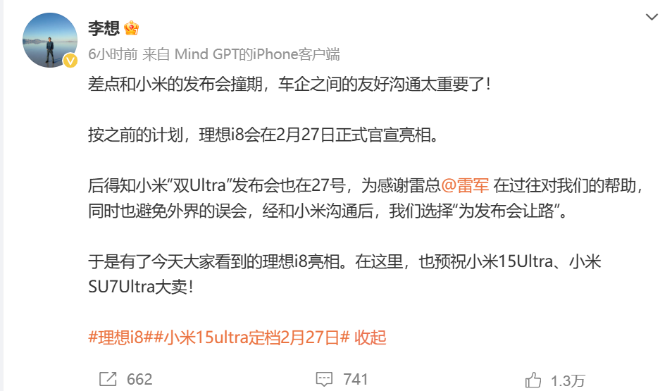 “按之前的计划,理想i8会在2月27日正式官宣亮相。后得知小米‘双Ultra’发布会也在27号,为感谢雷总@雷军 在过往对我们的帮助,同时也避免外界的误会,经和小米沟通后,我们选择‘发布会让路’。”