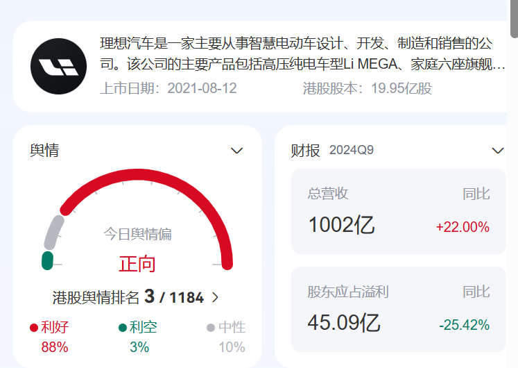从百度股市通分析来看,理想舆情极为正向,利好率高达88%,利空率仅为3%。