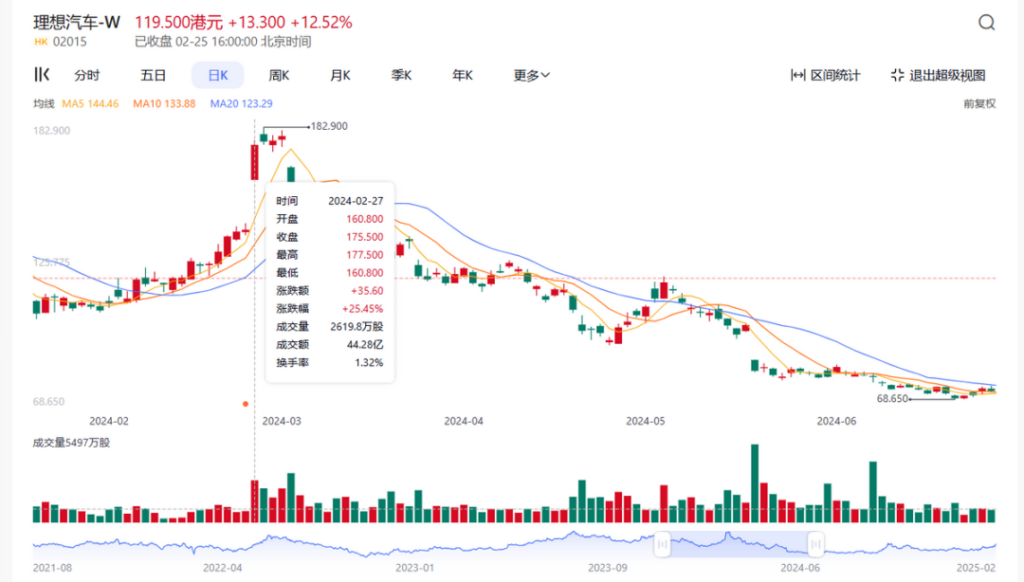 当日,理想汽车引爆美股市场,股价暴涨18.79%;次日,利好消息传导至港股,理想汽车港股股价狂飙至175.5港元/股,一日之内市值上涨超过740亿港元。2月28日,理想股票持续飘红,182.9港元/股的当日最高价几乎与历史股票最高股价持平。