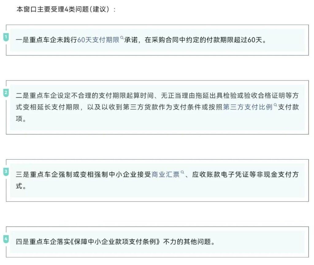 3、 重点车企强制或变相强制中小企业接受商业汇票、应收账款电子凭证等非现金支付方式。