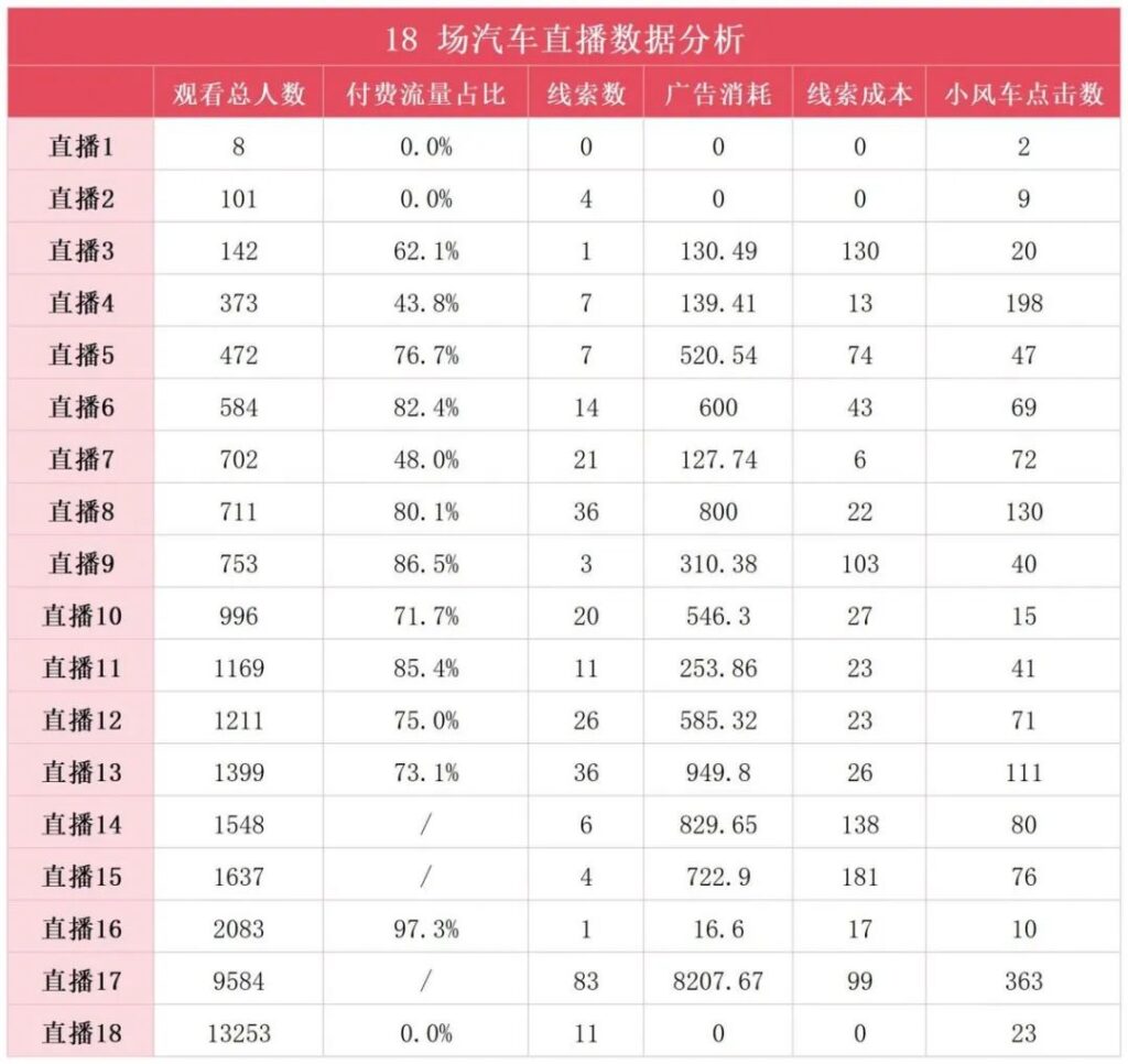 而想要靠直播投流获得相同的留资数,投入的成本往往数倍不止。随机抽取的18条直播数据,涵盖合资、自主品牌、新势力等多个维度,从数据来看,除却3家未进行投流的团队外,余下的15家中过半团队线索成本在30元以下,另有5家线索成本徘徊在百元上下。