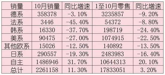 与之对应,合资品牌在华份额的逐步下滑已经定局。继续拿今年1-10月为例,德系、美系、日系、韩系该项数据,分别只剩14.9%、6.5%、11.2%、1.6%。其中,日系的“溃缩”尤为明显,美系、韩系更是处境严峻。