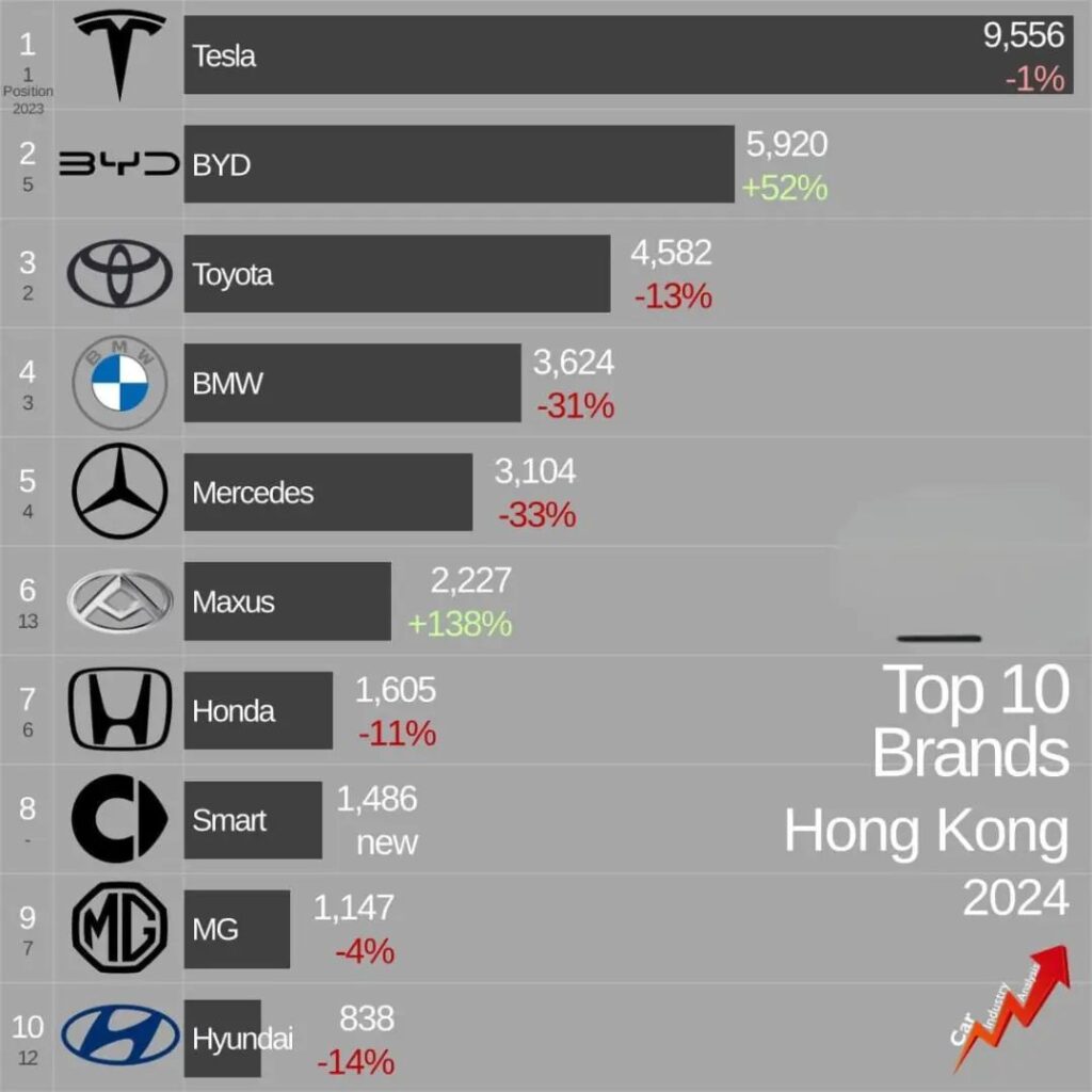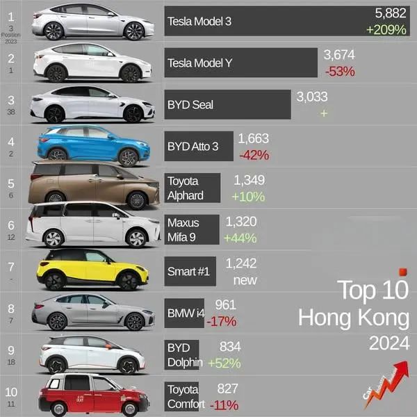 作为右舵驾驶市场,香港市场的丰田(尤其是标志性的Comfort出租车)和其他日本品牌一直拥有强大的市场份额。但近年来,特斯拉表现出色,其Model3和ModelY车型甚至一度占据市场榜首。