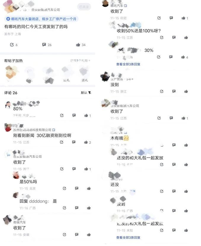 实际情况与回应有所出入。在某社交软件,有哪吒汽车前员工建群讨薪,为工资维权。在一条11月15日发布的“有哪吒的同仁今天工资发到了的吗”帖子下,既有回复没有收到的,也有回复收到的,但收到的工资金额为30%、50%、80%、100%不等。
