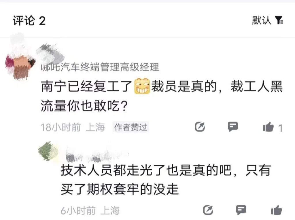 南宁工厂方面,一位在某软件认证为哪吒汽车终端管理高级经理的用户,于11月18日在一条哪吒汽车裁员的帖子下评论:“南宁(哪吒汽车工厂)已经复工了,裁员是真的。”