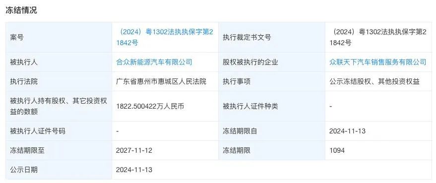 上游供应商不消停,下游经销商也没闲着。近日,合众新能源所持 1822 万股权被冻结,股权被执行的企业为众联天下汽车销售服务有限公司。