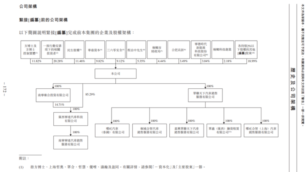 根据哪吒汽车6月提交的招股书,仅包括一致行动安排项目下的相关投资者(宜春、嘉兴)、民生股权(南宁)、华鼎资本(四川)、桐乡市财政局、合肥高新、桐乡科技创业在内,地方国资占比已超50%。
