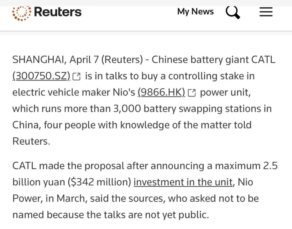 据路透社消息,中国电池业巨头宁德时代(CATL)正在洽谈收购电动汽车制造商蔚来的控股权。蔚来在中国运营着3000多个电池更换站。