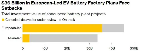 过去几年,欧洲一直努力建立本土电池产业链,试图打破中国在电动汽车领域的主导地位。但种种迹象表面,这一宏大的计划已接近失败。北伏遇挫,不是个例,数据显示,在计划中的16家欧洲主导的电池工厂中,有11家已被推迟或取消。