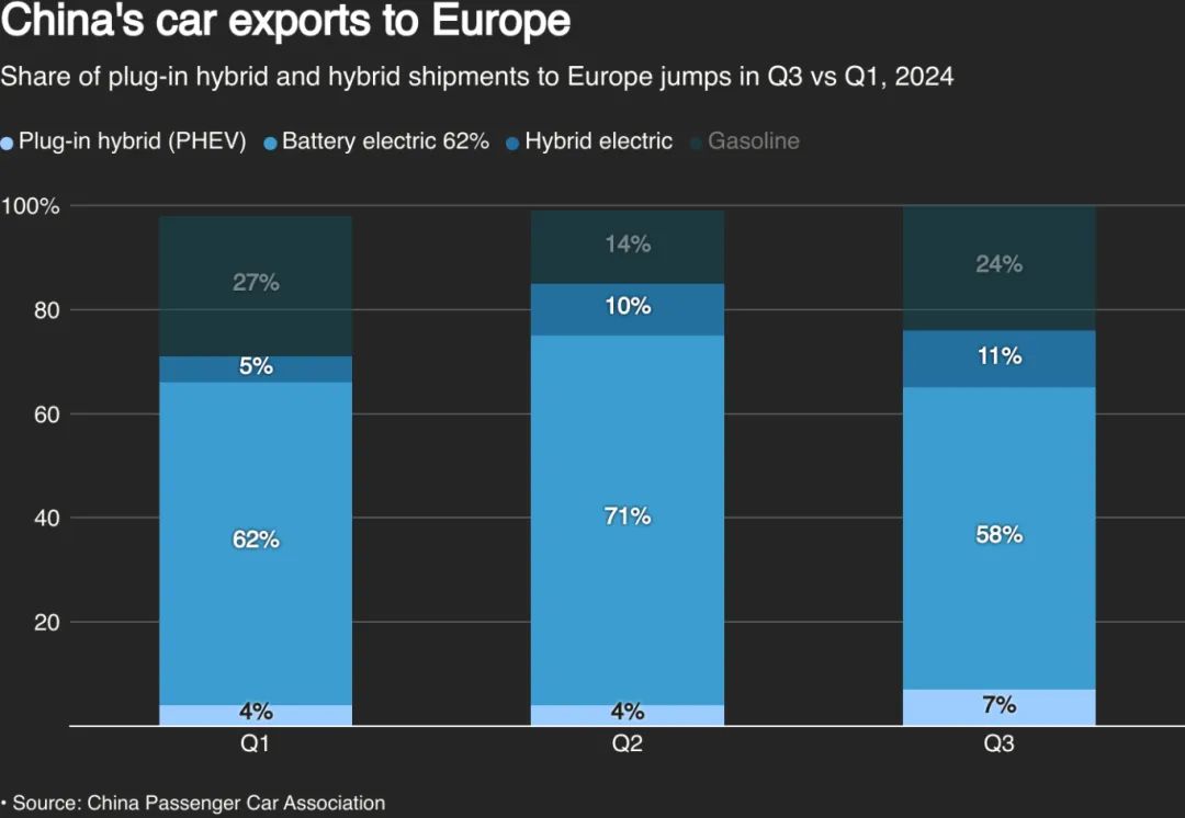 今年10月下旬,欧盟针对中国进口电动汽车加征了高达45.3%的关税,作为对欧盟委员会所称的不公平补贴的回应。数据表明,自2023年10月起,受中国电动汽车进口反补贴调查影响,一些汽车制造商已开始调整其欧洲市场战略,这使得混合动力汽车的出口变得愈加重要。