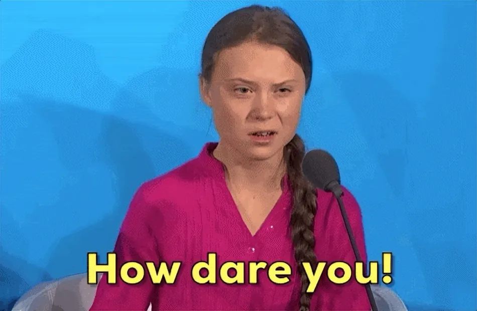 说到激动之处,她甚至为全球互联网亚文化圈,留下了这个“经典名句”,以及对应的表情包——HOW DARE YOU!