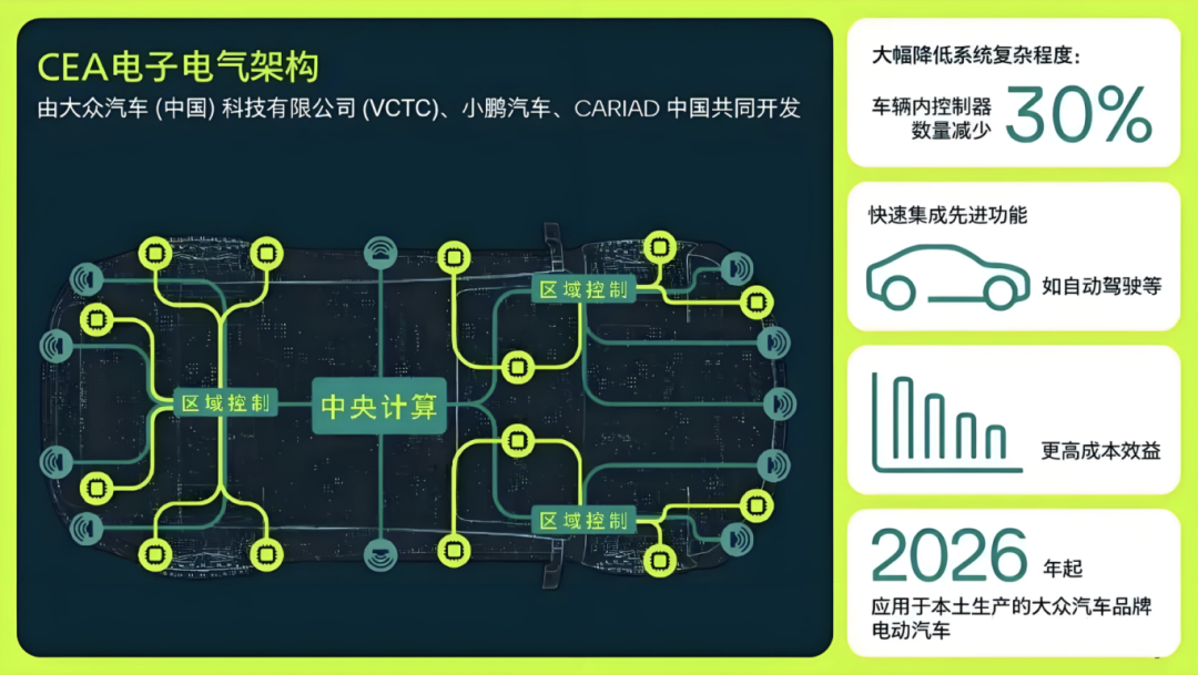 其中,贝瑞德所提到的CEA架构,是大众首个专门针对中国市场研发的电子电气架构,是由大众中国科技公司(VCTC)、CARIAD中国以及小鹏汽车三方携手共创的成果。其核心目标在于通过减少30%的控制单元数量和缩短50%的线束长度,来降低单车制造成本。