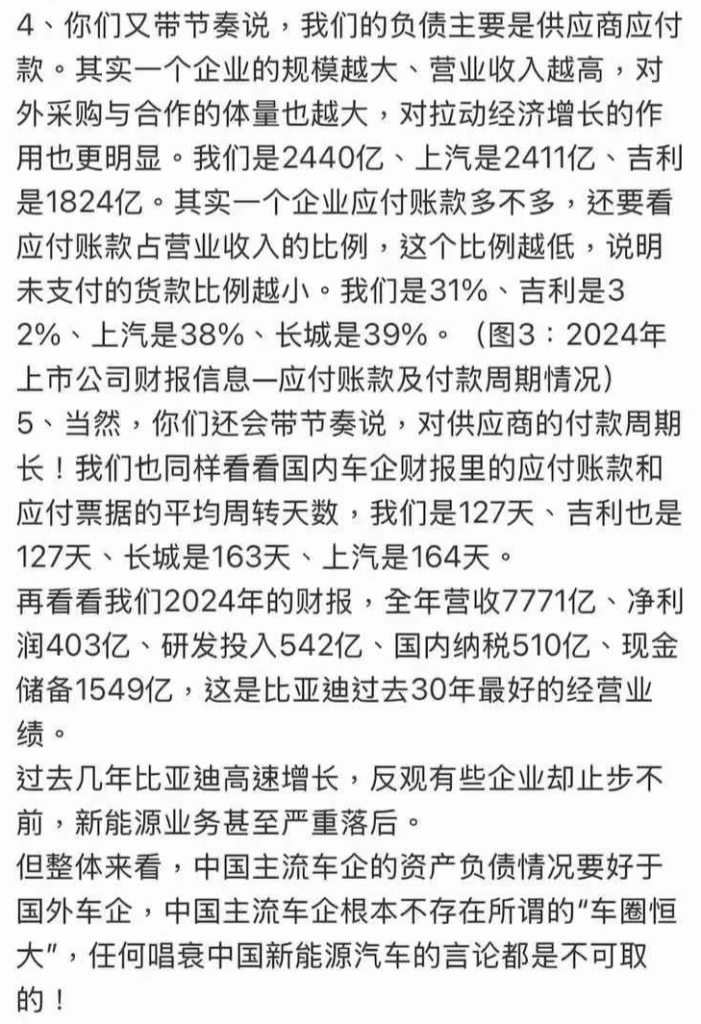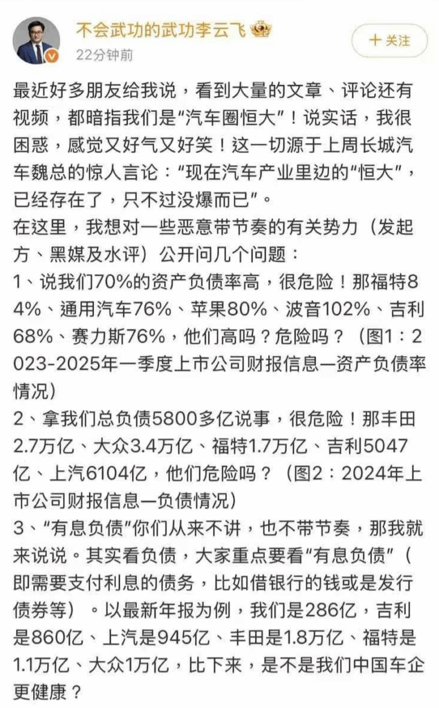 5月30日下午,比亚迪集团品牌及公关处总经理李云飞发文回应称,看到大量文章、评论、视频暗指比亚迪是“汽车圈恒大”,感觉又好气又好笑。并贴出了公开整理的各家车企的财务数据,称中国主流车企的资产负债情况要好于国外车企,中国主流车企根本不存在所谓的“车圈恒大”,任何唱衰中国新能源汽车的言论都是不可取的。