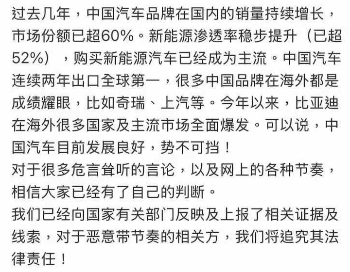 对于很多危言耸听的言论,比亚迪表示已经向国家有关部门反映及上报了相关证据及线索,对于恶意带节奏的相关方,将追究其法律责任。那么魏建军说的“汽车产业里的恒大”,究竟说的是谁呢?