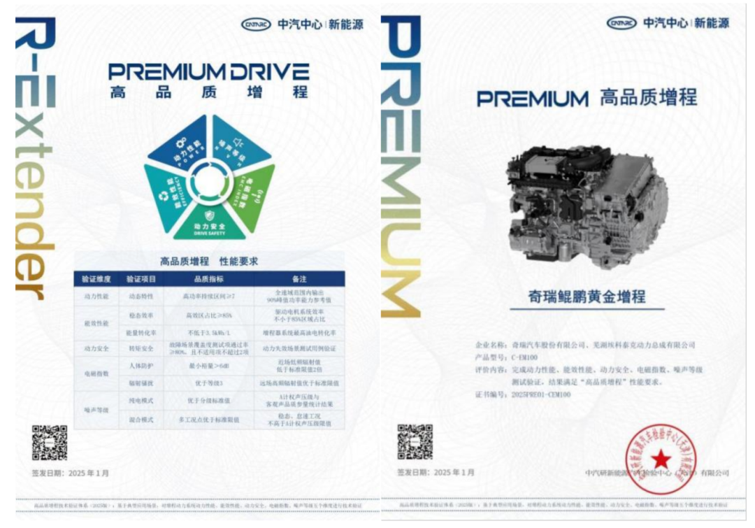 技术层面,在“鲲鹏动力”系统下,最近的一件事是,奇瑞自主研发的“鲲鹏黄金增程”系统通过了中汽中心新能源检验中心的“Premium Drive 高品质增程”技术验证,成为行业内首个获此认证的增程动力系统。搭载该系统的车型在续航里程、动力性能和燃油经济性等方面表现较为出色。