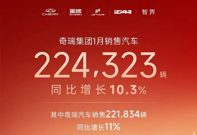在刚刚过去的1月,奇瑞集团整体销售汽车224,323辆,同比增长10.3%,这也是奇瑞连续6个月单月销量突破20万辆。不过值得注意的是,这里面没有出口数据。