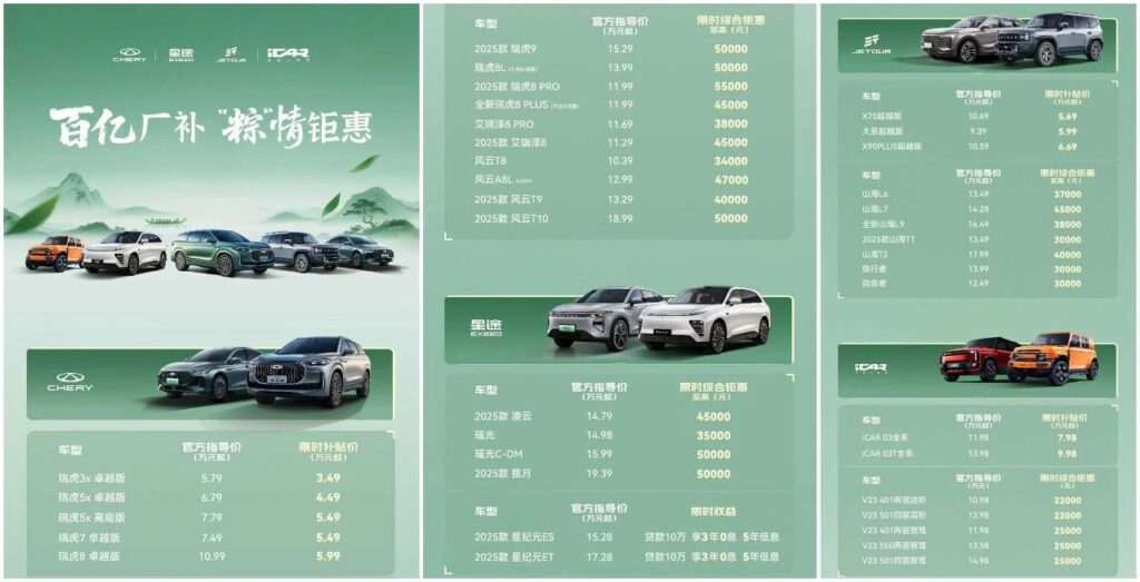 5月27日晚间,奇瑞汽车官方发布旗下四大品牌百亿厂补、“粽”情钜惠来袭的公告,正式宣布加入由比亚迪引发的新一轮价格战。这场始于新能源头部企业的价格博弈,正在演变为一场席卷整个行业的“生死对决”。