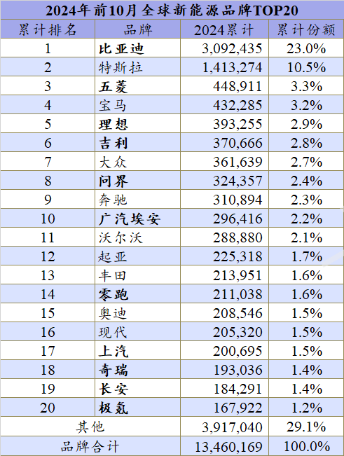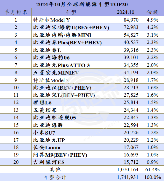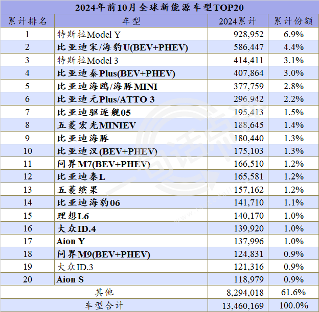 从10月和前10月全球新能源畅销车型销量TOP20榜单来看,虽然欧洲市场回暖,但因其体量几乎只相当于中国的20%,所以榜单中的绝大多数车型依旧是中国电动车,10月数量继续保持在18款的历史最高纪录。由于累计榜单变动非常少,因此主要以单月榜单为主。