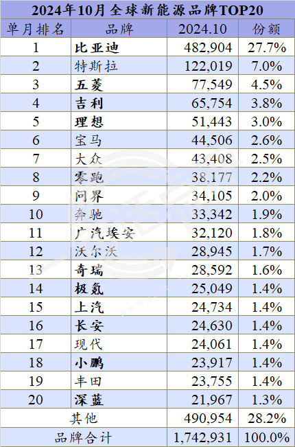 再从品牌榜单来看,比亚迪又一次刷新了人们的认知,10月继续攀升至48.3万辆,环比增加8.4万辆。这一数字只比特斯拉的最高季度销量纪录——去年四季度的48.5万辆少0.2万辆。