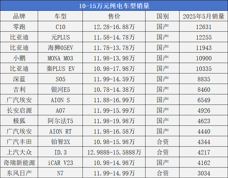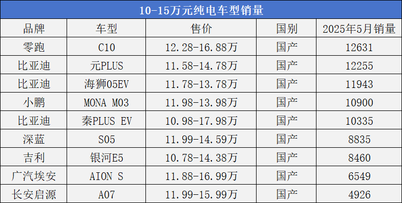 2025年5月份关于10-15万元区间纯电车销量的榜单中,我们依然能看到其中上榜的车型和品牌,几乎和前几个月没有太大区别。上榜的依然是那几家熟知的汽车品牌和车型,其他的品牌依然在这个市场毫无建树。