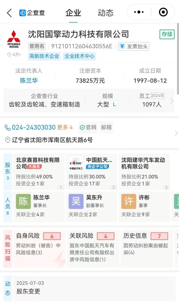 《汽车公社》注意到,沈阳航天三菱汽车发动机制造有限公司已于7月2日正式更名为沈阳国擎动力科技有限公司,法定代表人为陈兰华。与此同时,股东结构也有同步调整,三菱自动车工业株式会社等退出,新增北京赛苜科技有限公司。