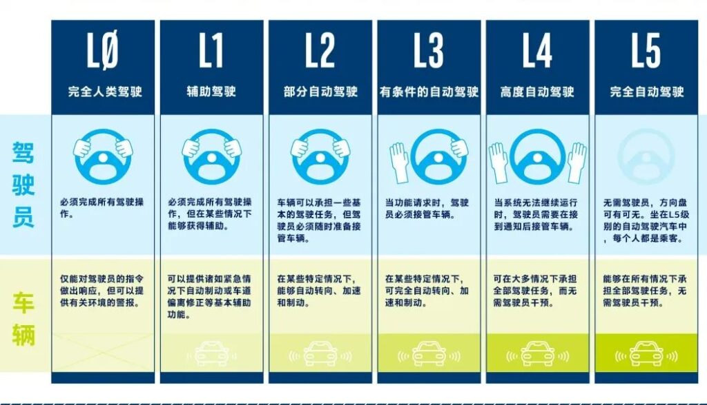 L0/1/2/3/4/5是美国汽车工程学会SAE设定的汽车驾驶自动化级别,按照车辆的功能以及控制权/责任的归属进行划分,从L0无自动化、L1辅助驾驶、L2部分自动驾驶、L3条件自动驾驶、L4高度自动驾驶到L5完全自动驾驶,级别依次提升。