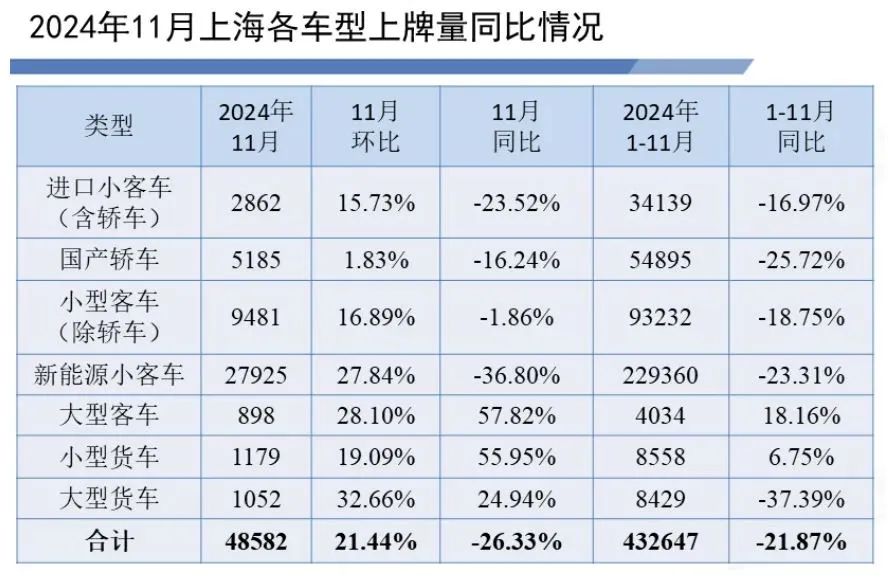 对于上海来说,2024年1-11月新车上牌总量为43.3万辆,同比下滑21.87%,当月上牌量为4.9万辆,同比跌26.3%。