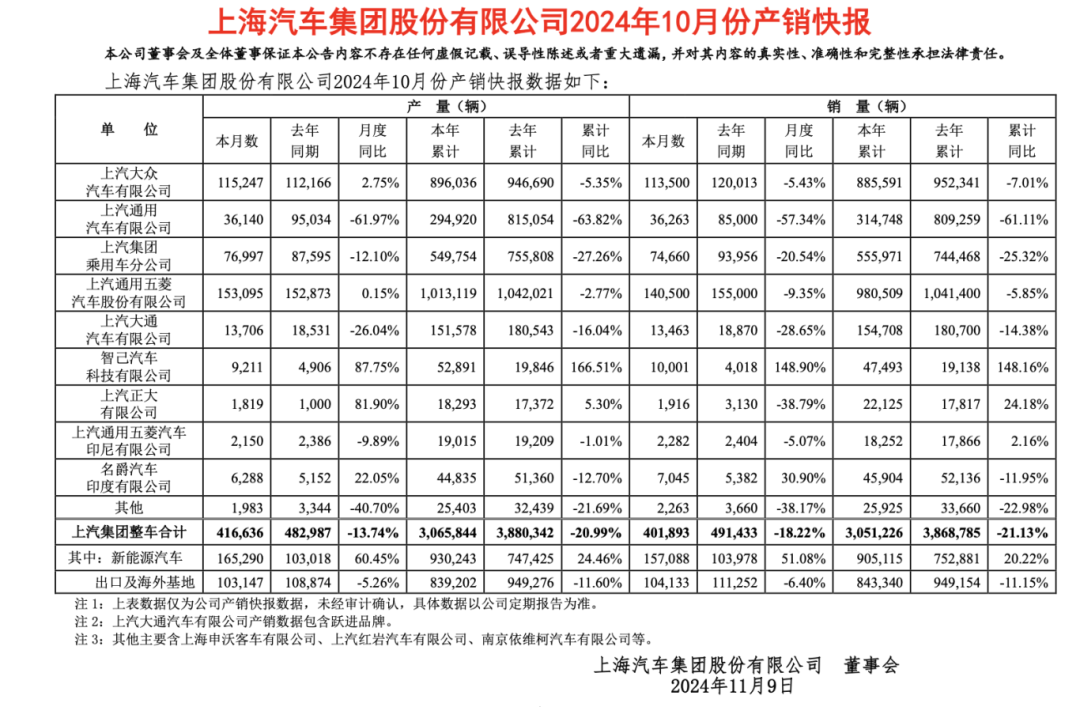 而作为国内汽车龙头之一,上汽集团在这个10月却表现的有些不温不火。数据显示,上汽集团10月销量40.19万辆,同比下滑18.22%;今年1-10月销量累计305.12万辆,同比下滑21%,销量减少81.76万辆。