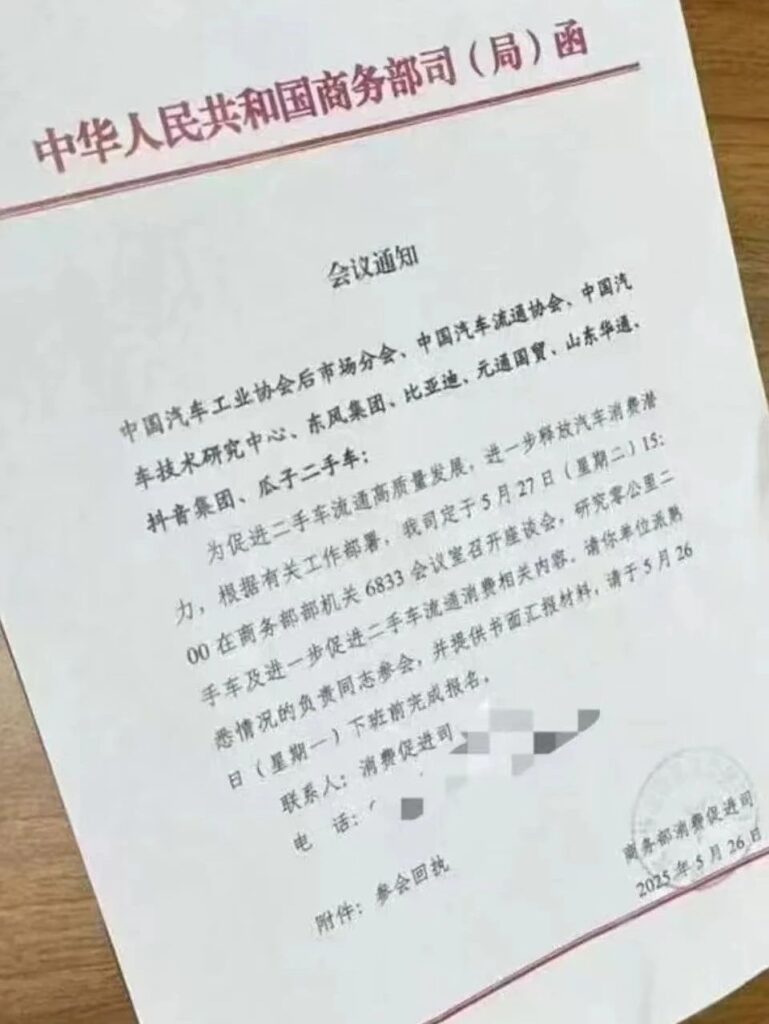 5月26日,一则商务部消费促进司关于零公里二手车的会议通知在圈内流传,称部分车企、下游公司及行业机构接到相关部门通知参与研讨会,主要议题是促进二手车流通高质量发展,对“零公里”二手车及进一步促进二手车流通消费相关内容进行研讨。