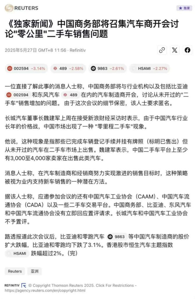 上周,长城汽车董事长魏建军在媒体采访中表示,由于中国汽车行业长年的价格战,中国市场出现了一种“零里程二手车”现象,中国二手车平台上至少有3000至4000家卖家在出售此类汽车,将零公里二手车一事情推向水面。