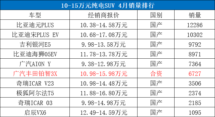 目前示界06只有一款车型,官方指导价为12.58万元。那么本文截取了今年4月份,10-15万元区间的纯电SUV市场的车型销量数据。在前10名中,基本上被国产车型覆盖,只有3月份上市的广汽丰田铂智3X,在4月份取得完整销量数据后,成为榜单中唯一一款合资车型。