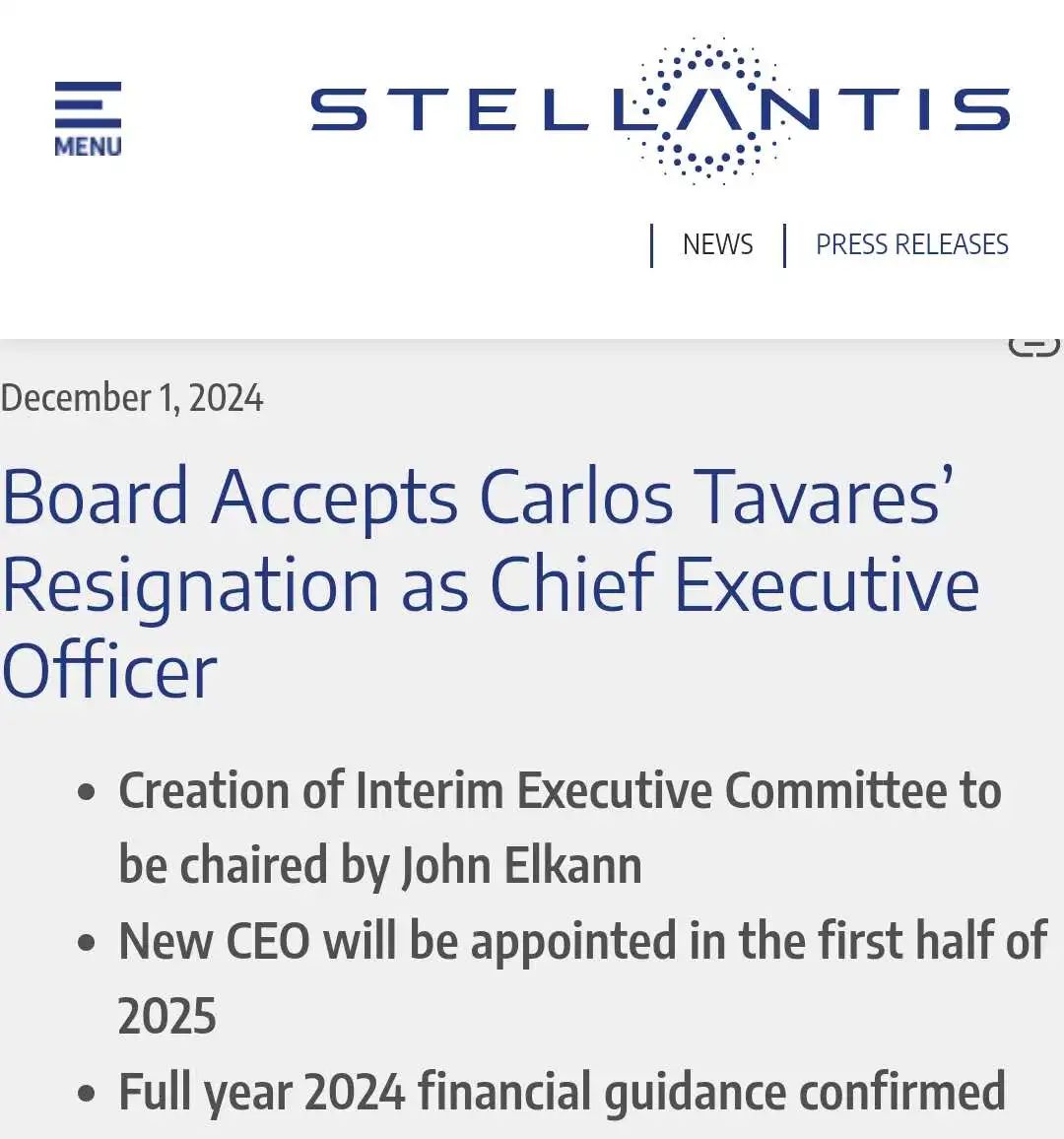 当地时间12月1日,Stellantis集团董事会发布正式声明,接受了唐唯实(Carlos Tavares)辞去集团首席执行官职务的请求。