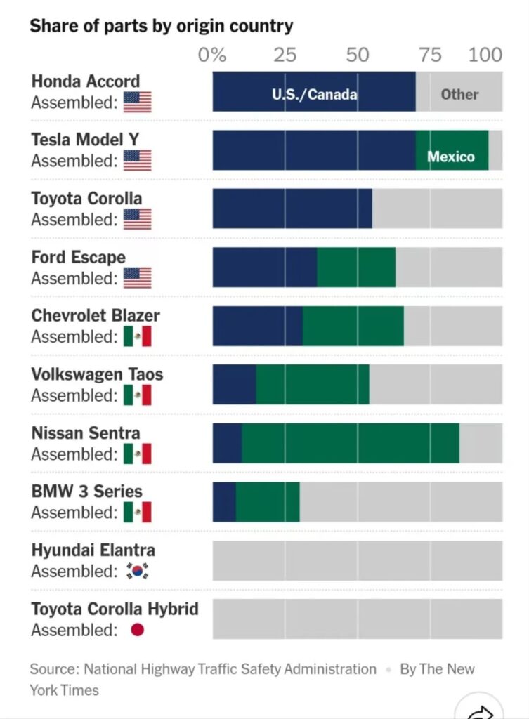 “美国制造”的界定,并非易事。特朗普的关税“炮轰”,或将破坏已存在超过25年的北美一体化供应链,因为汽车制造业是一个复杂的全球系统工程,在整车最终组装前,部分汽车零部件可能要跨越边境六次甚至更多。