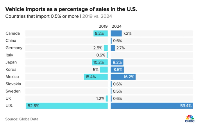 美国在线汽车交易平台Cars.com数据显示,美国新车库存,仅有一半左右在美国完成最终组装,约19%在墨西哥组装,4.2%在加拿大,1.4%则在中国。墨西哥和加拿大是美国最为重要的生产基地,但特朗普关税施加的压力,这两个国家未能幸免。