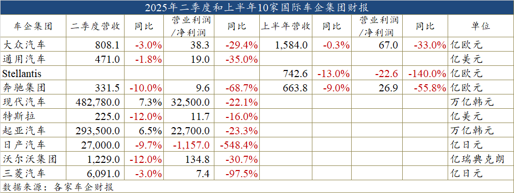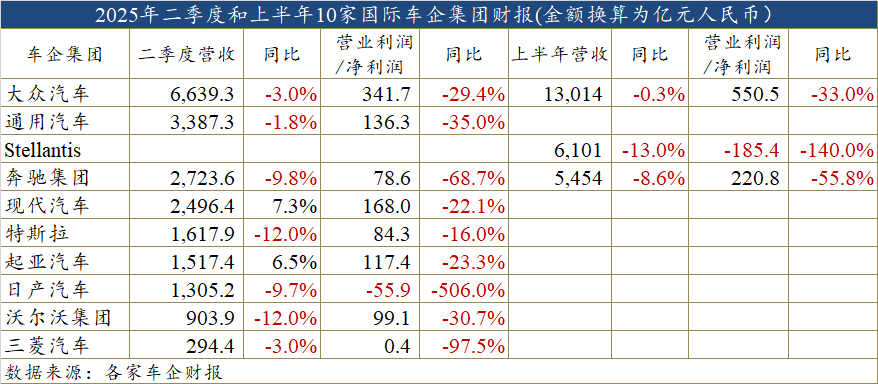 然而,通过整理近日10家跨国车企相继发布的今年二季度(即4月至6月,日系车企为2025财年第一财季)和上半年财报却发现,营收下滑和利润暴跌是普遍存在的,即便有车企营收实现不错的增长,利润也是大幅削减的。