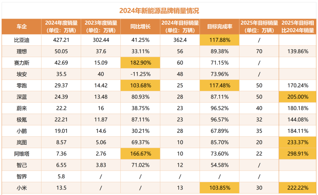 但2024年造车新势力的总销量为195.9万辆,在这其中,理想销量超50万辆,鸿蒙智行销量44.5万辆,零跑销量接近30万辆,小米汽车全年销量13万辆……在这些主力军的推动下,2024年全年中国汽车市场新创新势力品牌合计销量418.16万辆,虽然同比增47.9%,但相比破千万的产能,产能利用率依然是不小的瑕疵。